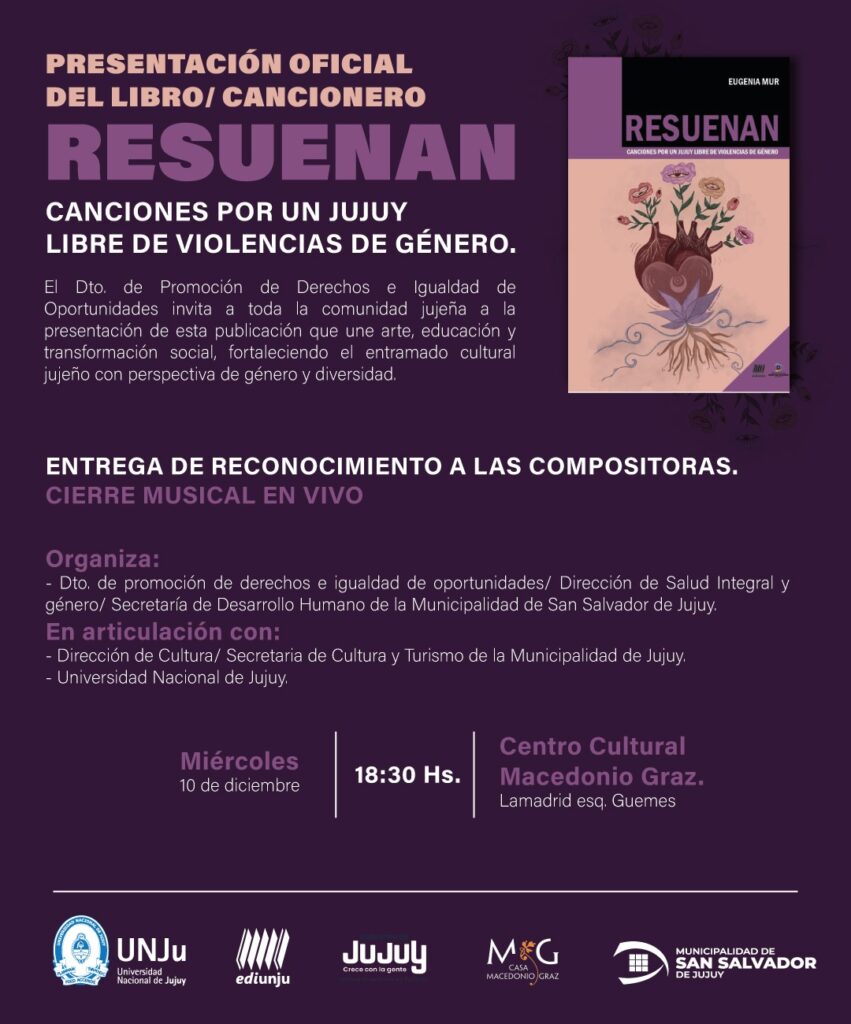 El Departamento de Promoción de Derechos e Igualdad de Oportunidades de la Municipalidad de San Salvador de Jujuy invita a la comunidad jujeña a participar de la presentación oficial del libro–cancionero “RESUENAN. Canciones por un Jujuy libre de violencias de género”, una obra que celebra la fuerza transformadora del arte y la creación colectiva.