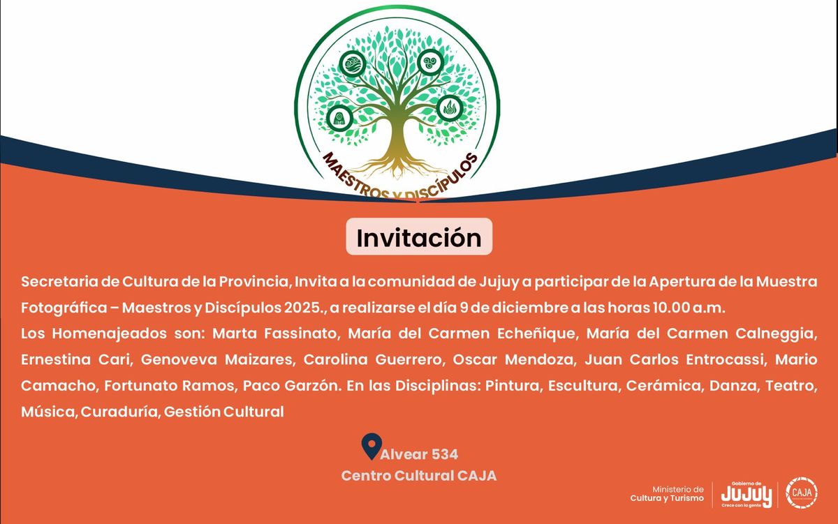 La Secretaría de Cultura de Jujuy, dependiente del Ministerio de Cultura y Turismo de la Provincia, invita al público en general a participar de la apertura de la Muestra Fotográfica del Programa Maestros y Discípulos 2025,
