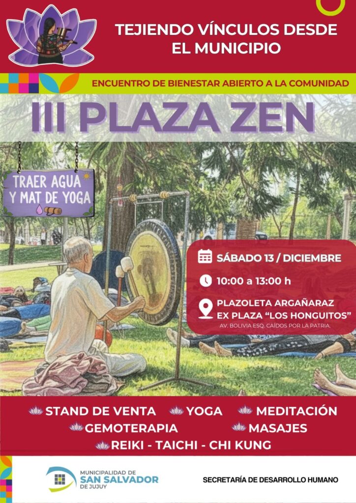 La Dirección de Salud Integral y Género de la Municipalidad de San Salvador de Jujuy anunció la realización de la 3ª edición de Plaza Zen, un espacio abierto a la comunidad destinado a promover el bienestar físico, mental y emocional a través de prácticas complementarias y actividades recreativas.