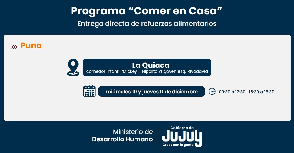 El Ministerio de Desarrollo Humano, a través de la Secretaría de Asistencia Directa, comunicó que desde el miércoles 10 de diciembre se realizará la entrega de las Unidades Alimentarias a familias titulares del Programa Comer en Casa de La Quiaca, Pumahuasi, Volcán y Humahuaca.