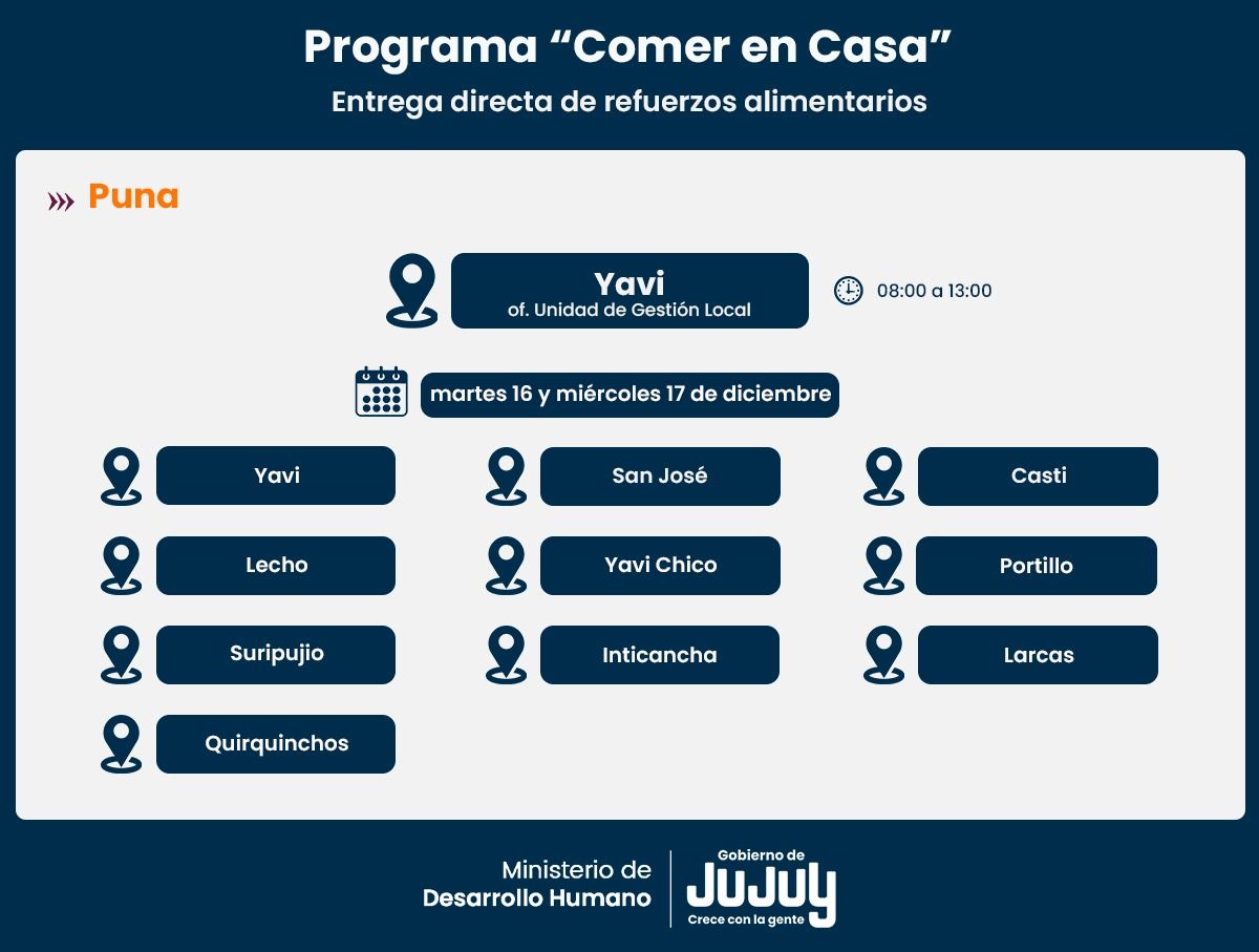 El Ministerio de Desarrollo Humano, a través de la Secretaría de Asistencia Directa, comunicó que desde el martes 16 de diciembre se realizará la entrega de las unidades limentarias a familias titulares del Programa “Comer en Casa” de Cieneguillas y Yavi.