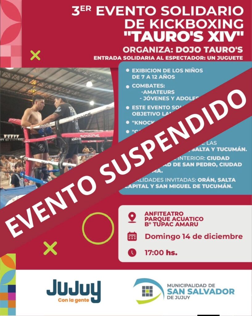 Desde la Municipalidad de San Salvador de Jujuy, se informa que el 3° Evento Solidario de Kickboxing “Tauro’s XIV”, previsto para el domingo 14 de diciembre en el Anfiteatro del Parque Acuático del B° Tupac Amaru, queda suspendido por razones de público conocimiento.