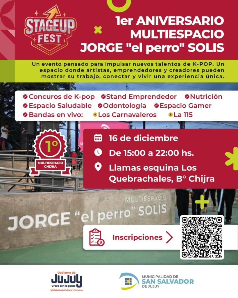 Con shows en vivo de Los Carnavaleros y La 115 como principales atracciones, la Municipalidad de San Salvador de Jujuy celebrará el primer aniversario del Multiespacio “Jorge ‘El Perro’ Solís” del barrio Chijra con el StageUp Fest, un evento que también incluirá concurso de K-POP, stands de emprendedores, espacios saludables y propuestas recreativas para toda la comunidad. La propuesta tendrá lugar el lunes 16 de diciembre, de 15 a 22 horas, en Llamas esquina Los Quebrachales.