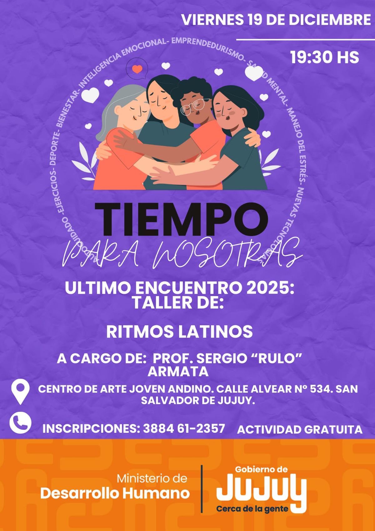El Ministerio de Desarrollo Humano de Jujuy llevará adelante el cierre del ciclo 2025 del espacio “Tiempo para Nosotras” el viernes 19 de diciembre, a las 19:30 horas, en el Centro de Arte Joven Andino (CAJA), ubicado en calle Alvear N° 534 de la ciudad capital.