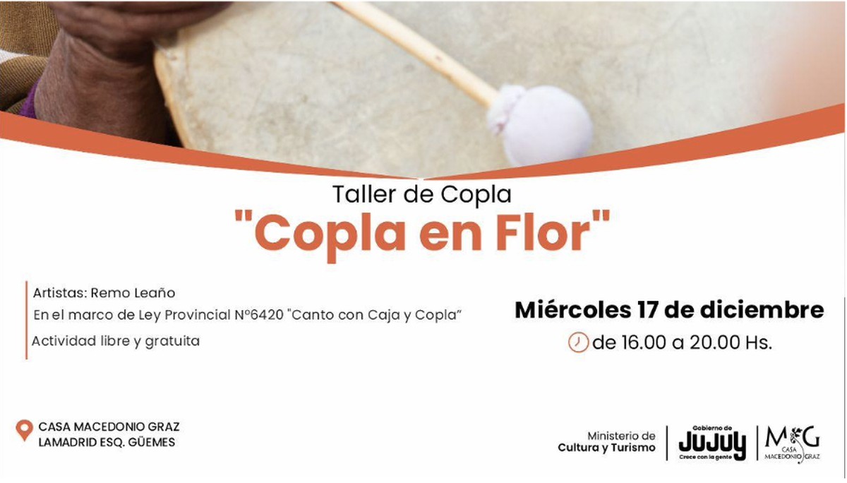 Remo Leaño, referente en la práctica y enseñanza de este género inscripto en la Ley Provincial N°6420 «Canto con Caja y Copla», conduce un taller donde la técnica se entrelaza con la historia, la poesía y la identidad cultural del noroeste. Durante cuatro horas, quienes participen podrán acercarse a los fundamentos del género, desde el manejo del instrumento hasta la estructura poética de la copla, en una experiencia que valora tanto el aprendizaje como el disfrute.