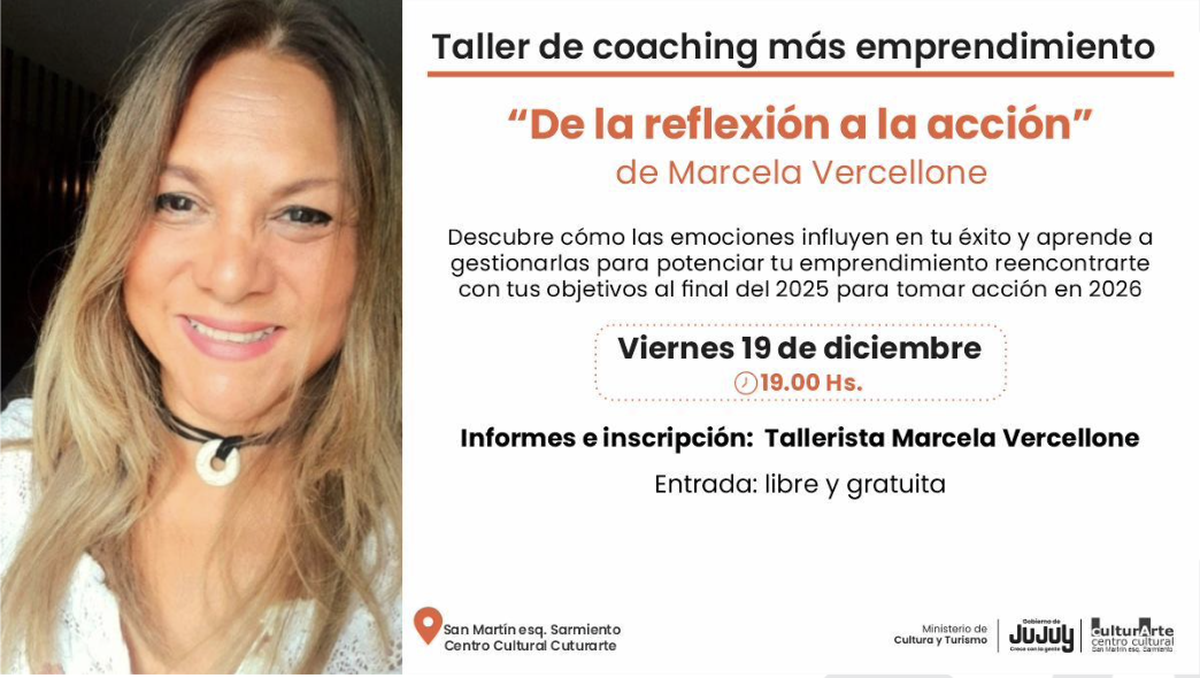 ¿Cómo nuestras emociones influyen en lo que emprendemos? ¿Qué pasa cuando aprendemos a gestionarlas conscientemente? El viernes 19 de diciembre, Marcela Vercellone trae al Centro Cultural Culturarte un taller de coaching pensado especialmente para emprendedores que quieren cerrar el año con claridad y abrir 2026 con dirección.