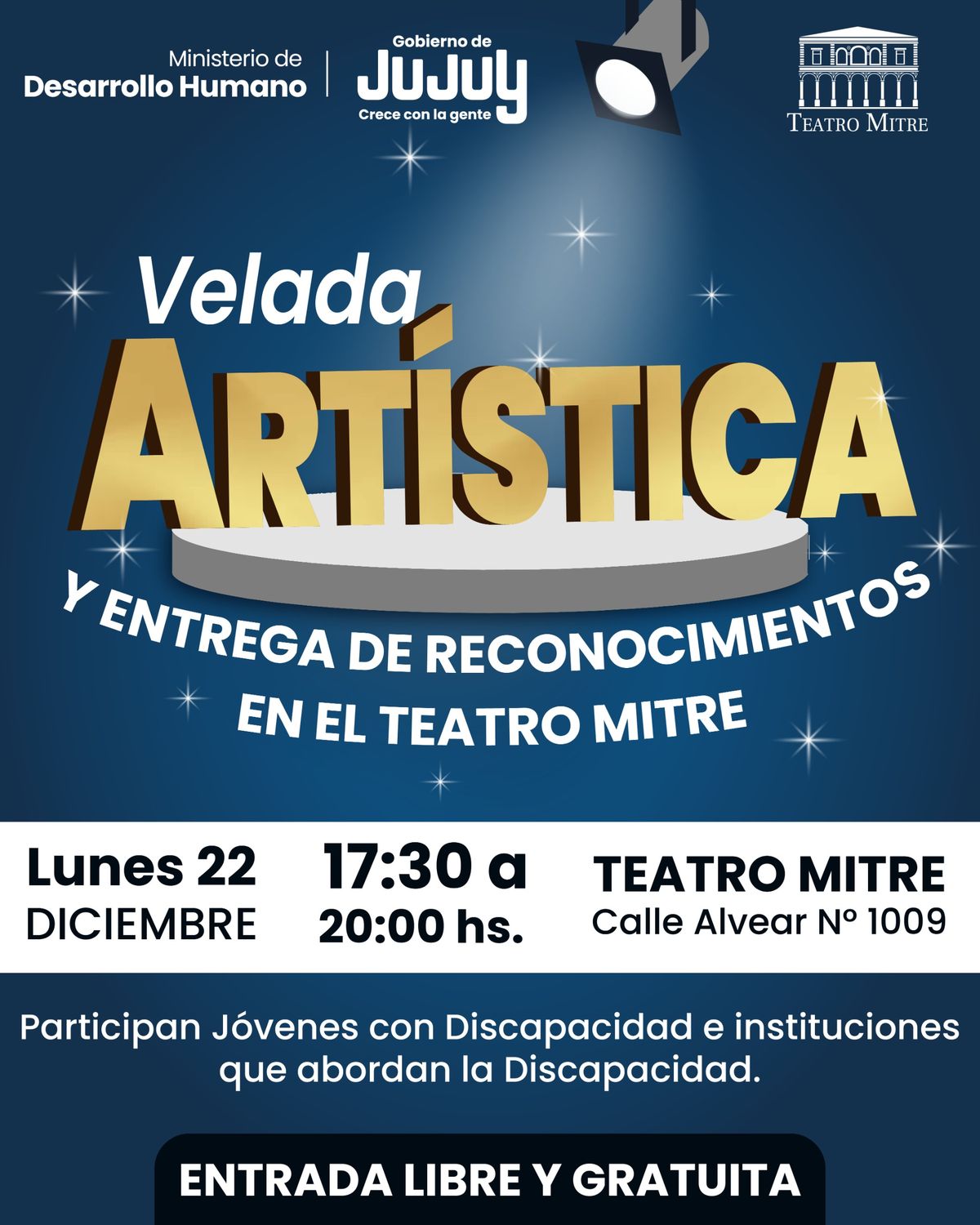 El Ministerio de Desarrollo Humano de la Provincia de Jujuy, a través de la Secretaría de Desarrollo Integral, llevará a cabo el próximo lunes 22 de diciembre, de 17:30 a 20:00 horas, la Velada de Talentos y Entrega de Reconocimientos, en el Teatro Mitre, ubicado en calle Alvear Nº 1009 de la ciudad de San Salvador de Jujuy.