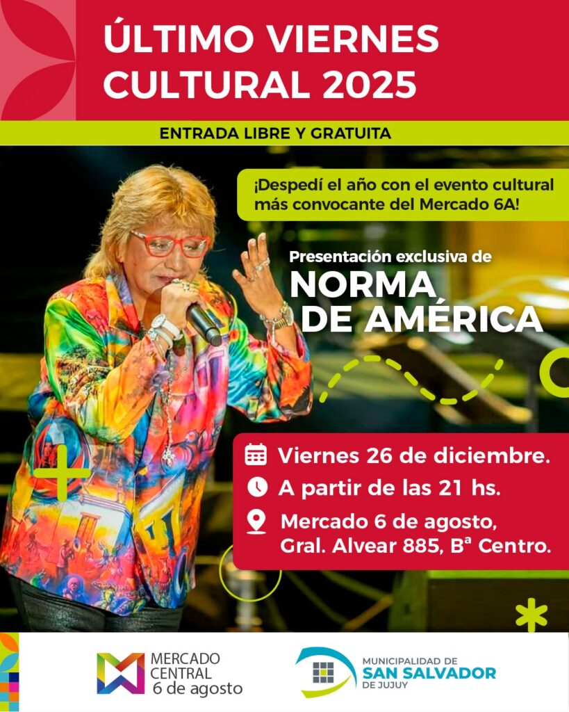 El Mercado 6 de Agosto invita a la familia a despedir el año con una propuesta cultural y musical, el viernes 26 de diciembre a partir de las 21 horas, para compartir una noche especial de celebración junto a Norma de América, una de las artistas más queridas y populares del folclore.