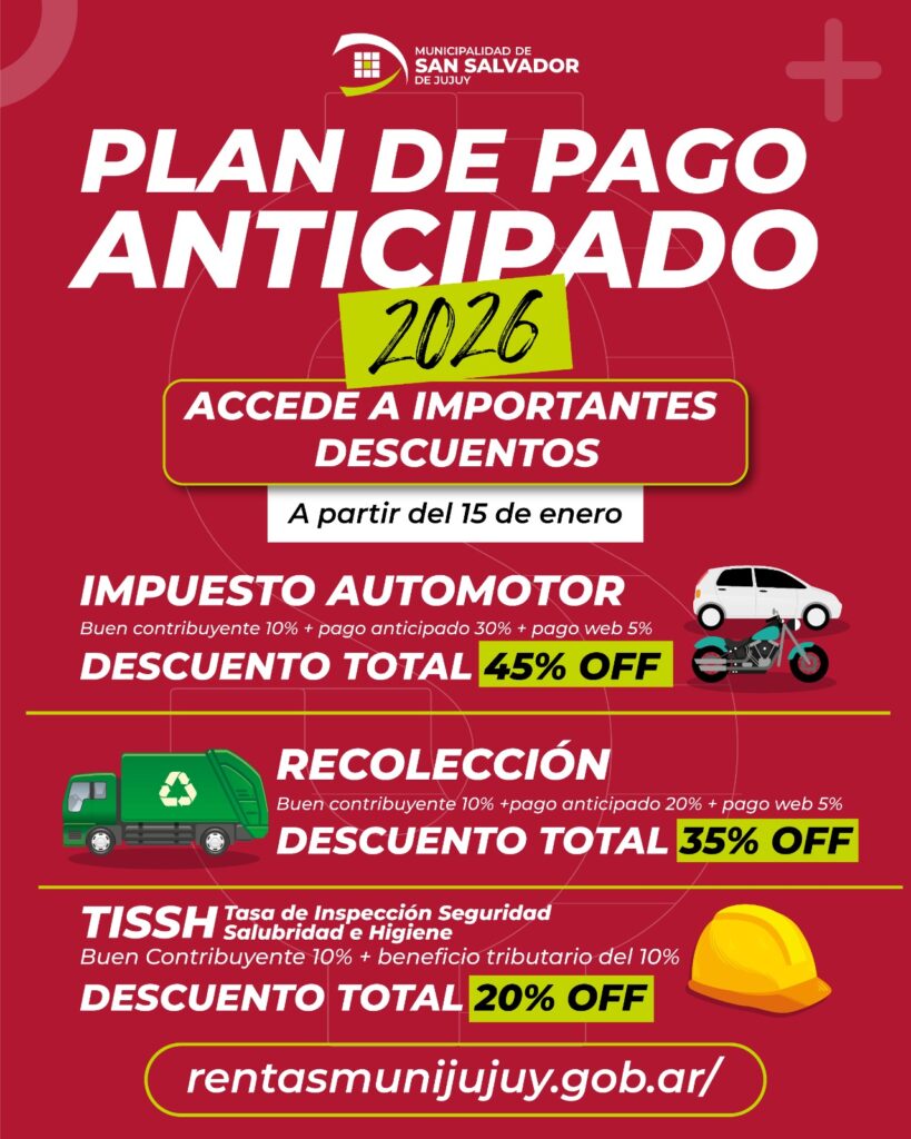 A partir del 15 de enero, la Municipalidad de San Salvador de Jujuy pondrá en vigencia el Pago Anticipado 2026 de Impuestos, una modalidad que permite a los contribuyentes acceder a importantes beneficios y descuentos. La iniciativa estará disponible en todas las bocas de cobro habilitadas de la ciudad y también de manera online, a través del sitio web oficial www.rentasmunijujuy.gob.ar, facilitando un trámite ágil, cómodo y seguro.