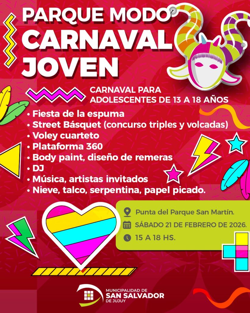 Este sábado 21 de febrero, de 15 a 18 horas, se realizará el Carnaval Joven en las instalaciones del Centro Deportivo Municipal N°1 “Pajarito” Cid Conde, ubicado en la punta norte del Parque San Martín. La propuesta está destinada a adolescentes de entre 13 y 18 años y combinará deporte, música y múltiples actividades recreativas en un marco festivo y seguro.