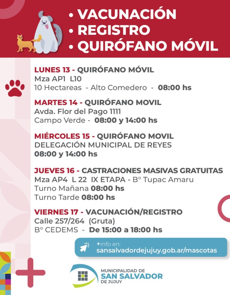 San Salvador de Jujuy avanza con una nueva semana de acciones territoriales impulsadas por la Dirección de Zoonosis, que llevará adelante un cronograma de castraciones, vacunación y registro de mascotas en diferentes sectores, con el objetivo de promover la tenencia responsable y el cuidado de la salud animal.