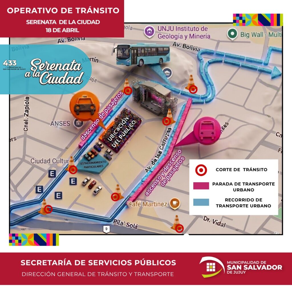 La Dirección de Tránsito y Transporte, dependiente de la Secretaría de Servicios Públicos de la Municipalidad de San Salvador de Jujuy, informó sobre el operativo especial de ordenamiento vehicular que se implementará durante el fin de semana, en el marco de las celebraciones oficiales. Las medidas dispuestas corresponden al sábado 18, en el marco de la Serenata a la Ciudad en Ciudad Cultural, y al domingo 19, por el acto protocolar y el desfile cívico, escolar y gaucho previstos por un nuevo aniversario de la fundación de San Salvador de Jujuy.