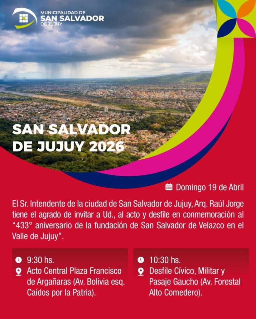 La Municipalidad de San Salvador de Jujuy invitó a la comunidad a participar de los actos conmemorativos por el 433° aniversario de la fundación de la ciudad, que se llevarán a cabo el próximo domingo 19 de abril.